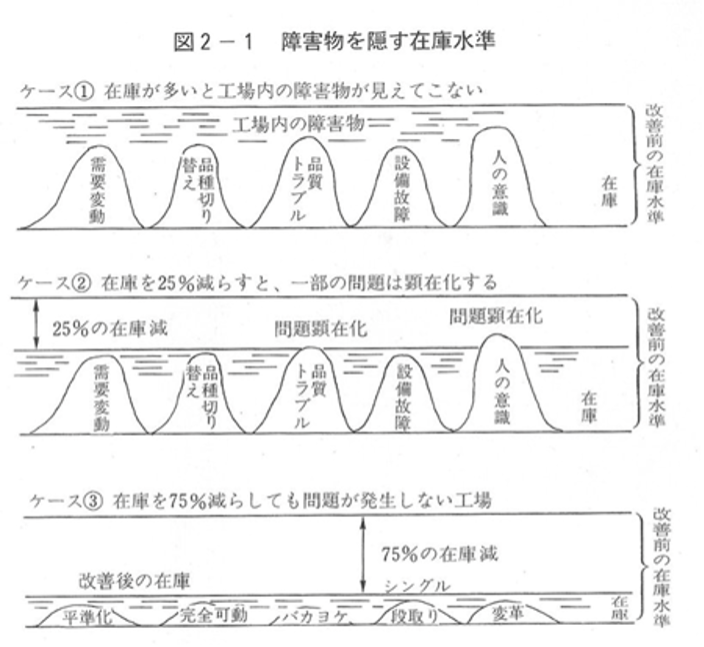 在庫水準が下がっていくと、各ムダ要素から発生する問題が顔を出してきます。この問題を解消しながら在庫水準を下げていきます。