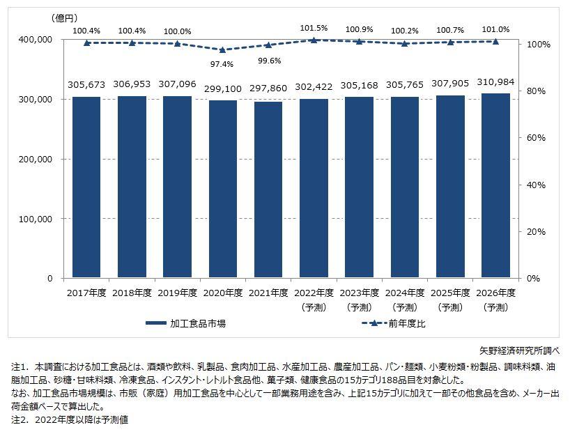 以下は、矢野経済研究所による日本国内の食品市場の推移のデータですが、