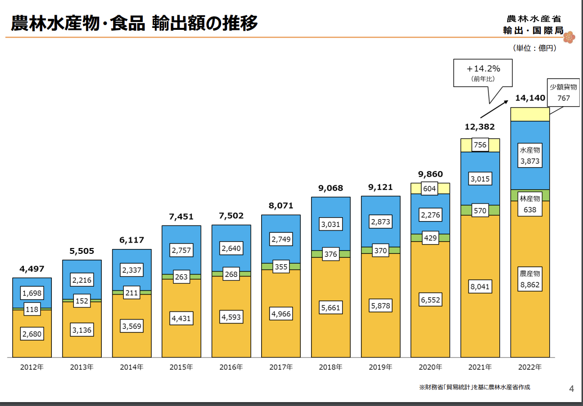 食品輸出額は年々増加を続けており、2022年の輸出総額は1兆4,140億円。